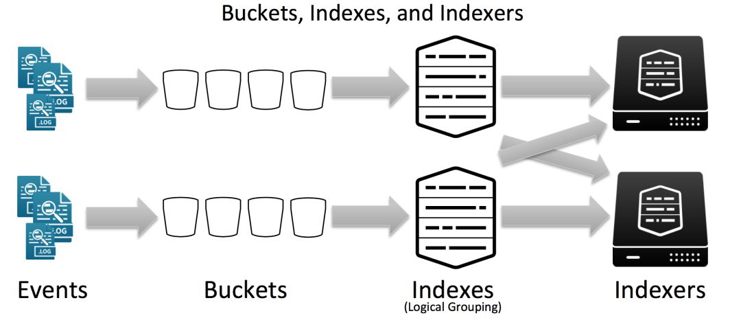 Splunk的Event存在许多Buckets中,多个Buckets构成逻辑分组的索引分布在Indexer上。