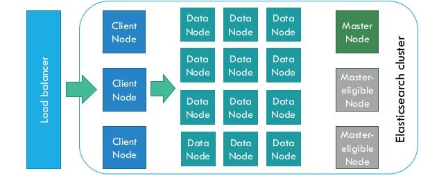 ElasticSearch是为分布式设计的,有很好的扩展性,在一个典型的分布式配置中,每一个节点(node)可以配制成不同的角色,如上图所示: