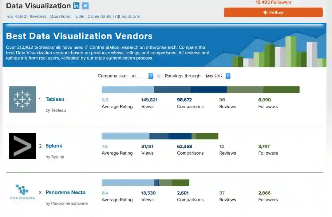 在数据可视化的领域的排名,Splunk仅仅落后于Tableau而已