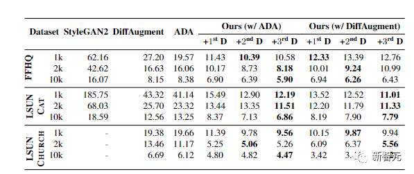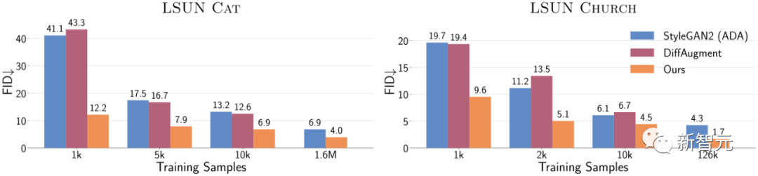 而在完整的数据集上,该方法在LSUN的猫、教堂和马的类别上提高了1.5到2倍的FID。