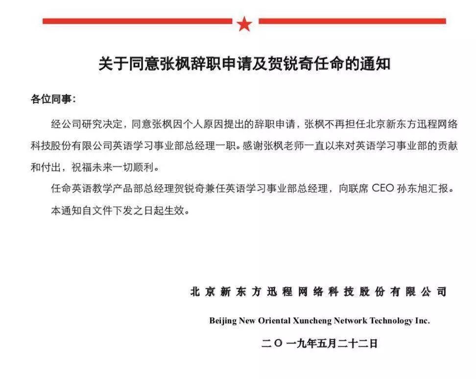 在这个变动行列中的,既包括英语学习事业部总经理张枫、儿童产品事业部总经理陈婉清这样的一线业务部门领导,也包括客服部总监蔡凌、互联网中台部包颖等支持部门负责人。其中,“新东方在线”内部发文显示,张枫因个人原因离职,由贺锐奇接任;而包颖据了解则已调往新东方旗下的在线职业教育平台职上网。
