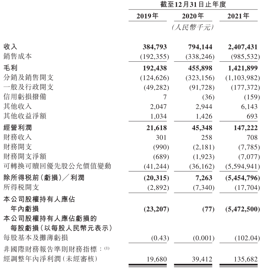 营收方面,蕉下近三年的营收一路高涨,从2019年的3.85亿元,增长到2020年的7.94亿元, 2021年进一步提升至24.07亿元。2019年至2021年的经调整年内净利润,分别为1968万元、3941万元和1.36亿元。