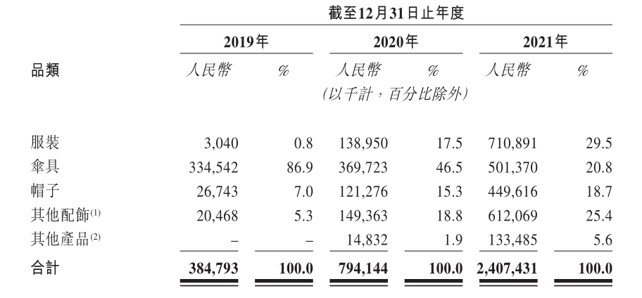 其中帽子作为毛利率最高的产品,其销售收入在2021年达到4.5亿元,占比为18.7%。
