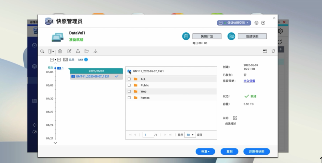 首先是快照的功能,快照的意思是可以在指定的时间,比如每天晚上凌晨两点,记录一次当前文件的状态。万一你的文件遇到了什么问题,比如误删或者遭到病毒袭击,你就可以通过快照来恢复到之前那个时间点。