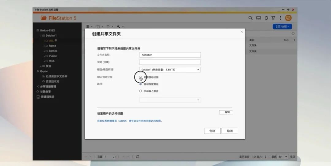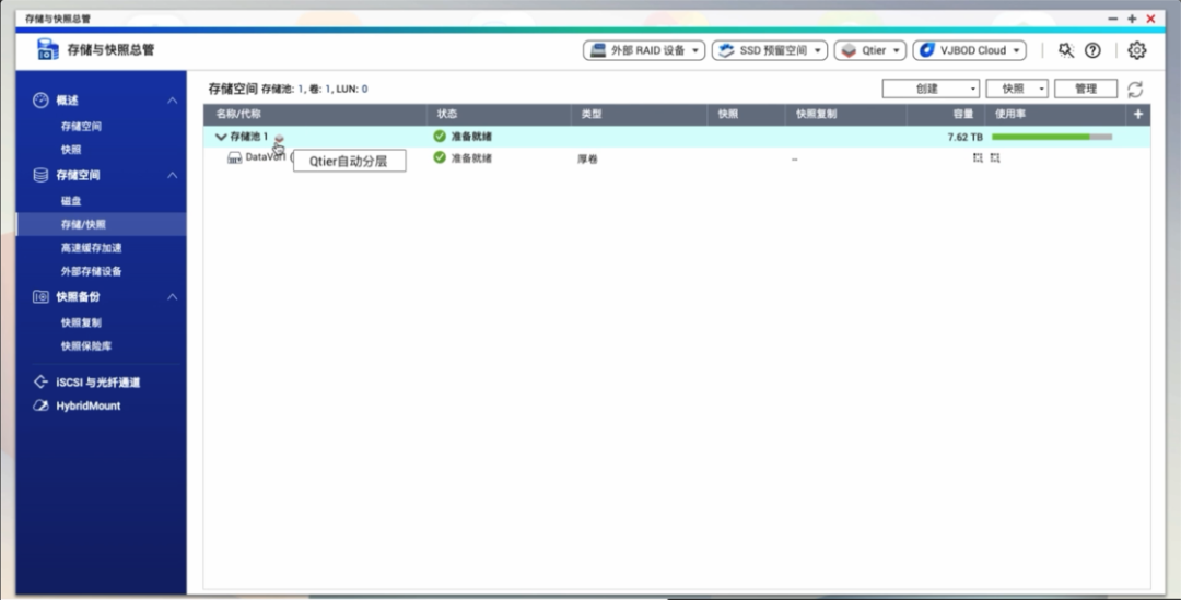第三种是配合 HDD 通过 QNAP 自家的招牌 Qtier 自动分层技术,将 HDD 和 SSD 进行合并来实现更高的读写速度,在存储池这里可以看到一个分层的标示。