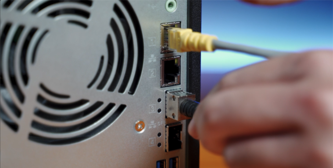 机身背部除了两个千兆电口和两个 USB 3.0 口。就是我最关心的两个万兆光口了,用它配合 QNAP 自家的雷电 3 转万兆转换器,就能在我的 MacBook Pro 上,实现最为简单的万兆内网的建设。