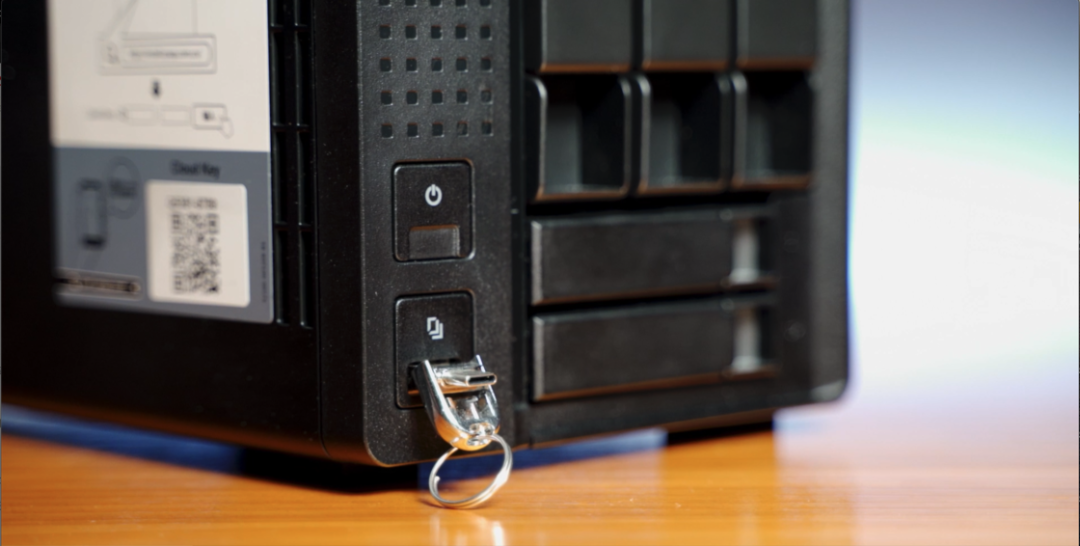 机身的正面除了硬盘槽位,就是开机键和一键备份的 USB 口。