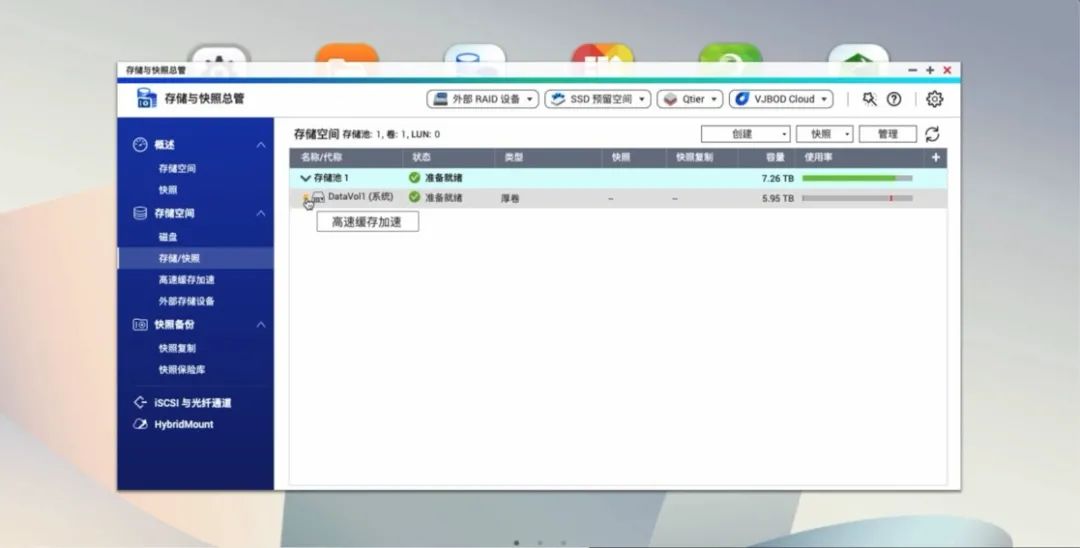 第二种是把 SSD 当作 HDD 的缓存加速,可以让 HDD 的读写速度得到一定的提升,在存储池这里可以看到一个闪电的标志。