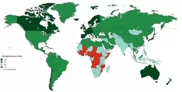 世界各国人的预期寿命(深绿色:80多岁;绿色:70多岁;浅绿色:60多岁;红色:50多岁)