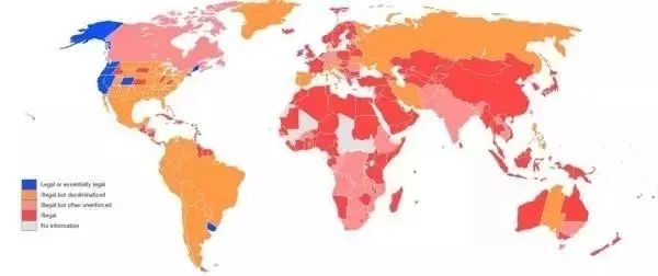 世界各国和地区对于持有大麻的规定(蓝色区域:合法;橙色区域:虽不合法但已除罪化;粉色区域:虽不合法但经常不执行;红色区域:不合法)