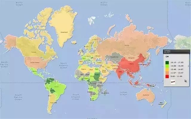 男性平均丁丁长度:厘米(红色:9.66-1166-11.66,粉色:11.67-1367-13.47,黄色:13.488-14.87,浅绿:14.88-1688-16.09,深绿:16.10-1710-17.93,论这个亚洲东部就反绿为红了....)