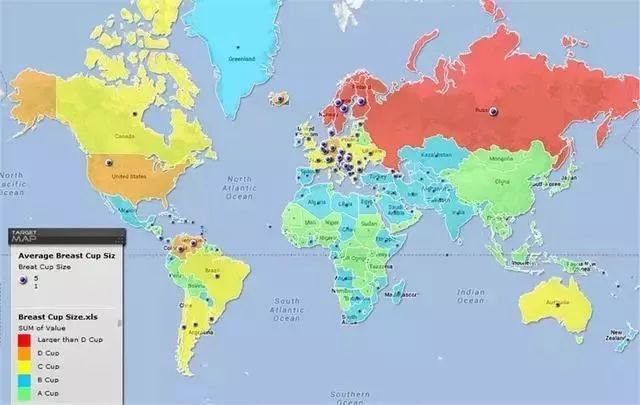 女性平均胸部罩杯(绿色A,蓝色B,黄色C,棕色D,红色D以上,亚洲东部集体绿色啊...)