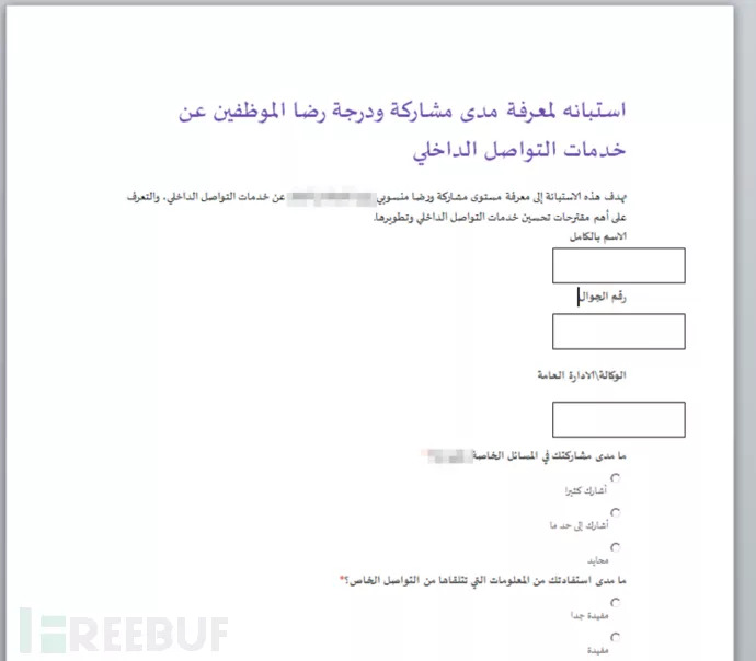 这两个文档都使用了attachmentTemplate技术,通过将凭证发送到URL https://0utl00k[.]net/docs来对其进行窃取。与2018年6月的文档不同,在凭证被窃取之后,这两个文档都呈现了与目标受害者相关的内容。其中,2017年9月的文档呈现的是一份员工调查表,如图2所示。
