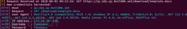 在C2服务器上,我们观察到Phishery收到了入站请求并获取到了凭证,如图7所示。具体来讲,当我们打开DarkHydrus的Word文档时,C2服务器能够获取到我们在身份验证对话框中输入的“fakename”和“fakepass”。