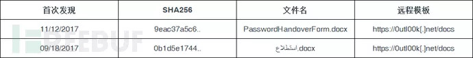 我们利用0utl00k [.]net域找到了另外两个用于窃取凭证的Word文档,如表1所示。我们首次发现这两个文档的时间分别是在2017年9月和11月,这表明DarkHydrus几乎一直在进行这种凭证窃取活动。