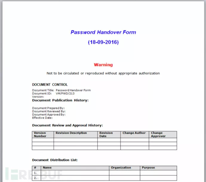 2017年11月的文档呈现的是一份密码移交表,如图3所示。我们没有能够在已公开的研究中找到相同的文档,这可能表明这份密码移交表是攻击者在其以前的活动中收集到的。