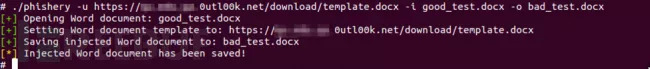 我们利用Phishery创建了一个用于测试的文档,并使用了图4中的远程模板URL。图5展示了这个过程,Phishery能够将这个URL注入到我们所创建的名为“good_test.docx”的文件中,我们将生成的文件保存为“bad_test.docx”。
