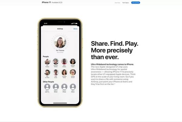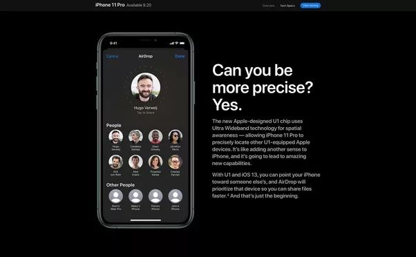 苹果全新设计的 U1 芯片将利用超宽带(Ultar Wideband)技术实现空间感知——允许 iPhone 11 精确定准其它配备有 U1 的苹果设备。这类似于在客厅之内建立 GPS 体系。因此,如果您希望与他人通过 AirDrop 共享文件,只需要将 iPhone 指向他们的 iPhone,对方的设备就会在您的搜索列表中排在第一位。