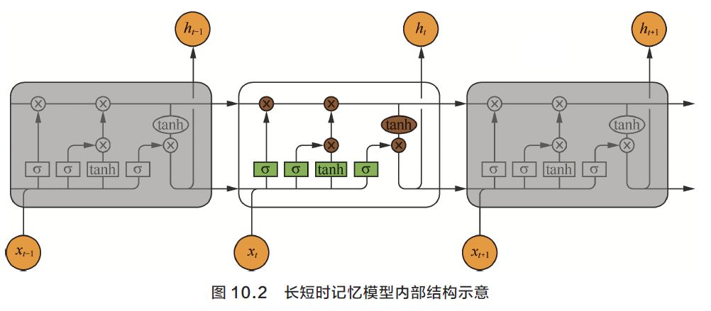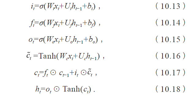有图有真相,我们首先结合LSTM 结构图以及更新的计算公式探讨这种网络如何实现其功能,如图10.2 所示。