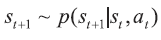 在策略梯度中,我们考虑前后两个状态之间的关系为,其中st、st+1 是相继的两个状态,at 是t 步时所采取的行动,p 是环境所决定的下个时刻状态分布。而动作at 的生成模型(策略)为