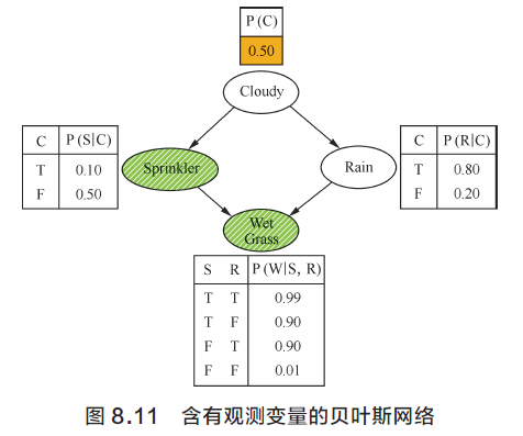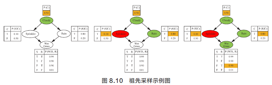 接下来考虑含有观测变量的贝叶斯网络的采样,如图8.11 所示。网络中有观测变量(Sprikler=T,WetGrass=T)(观测变量用斜线阴影表示),又该如何采样呢?最直接的方法是逻辑采样,还是利用祖先采样得到所有变量的取值。如果这个样本在观测变量上的采样值与实际观测值相同,则接受,否则拒绝,重新采样。这种方法的缺点是采样效率可能会非常低,随着观测变量个数的增加、每个变量状态数目的上升,逻辑采样法的采样效率急剧下降,实际中基本不可用。