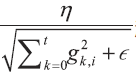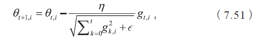 其中θt+1,i 表示(t+1)时刻的参数向量θt+1的第i个参数,gk,i表示k时刻的梯度向量gk 的第i 个维度(方向)。另外,分母中求和的形式实现了退火过程,这是很多优化技术中常见的策略,意味着随着时间推移,学习速率越