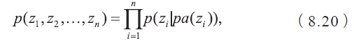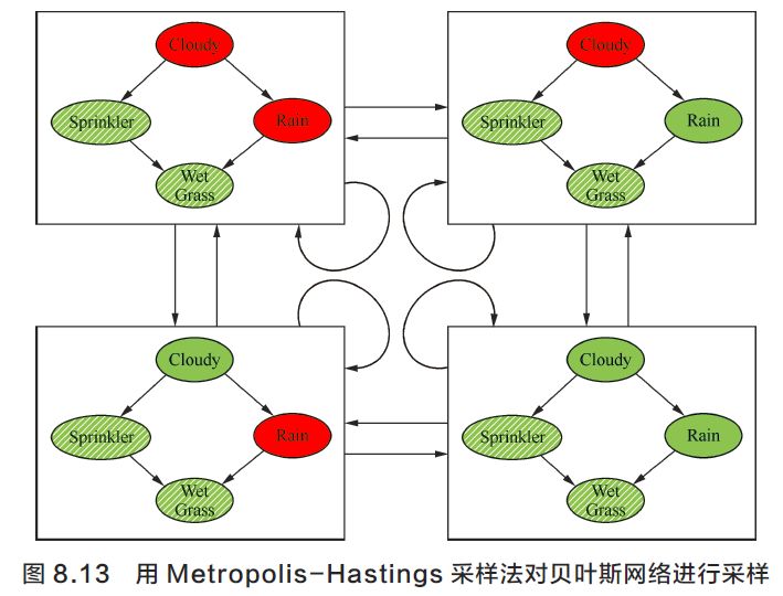 除此之外,还可以用MCMC采样法来进行采样。具体来说,如果采用Metropolis-Hastings 采样法的话,如图8.13所示,只需要在随机向量(Cloudy, 、Rain)上选择一个概率转移矩阵,然后按照概率转移矩阵不断进行状态转换,每次转移有一定概率的接受或拒绝,最终得到的样本序列会收敛到目标分布。最简单的概率转移矩阵可以是:每次独立地随机选择(Cloudy, Rain)的四种状态之一。如果采用吉布斯采样法的话,根据条件概率p(Cloudy|Rain,Sprinkler, WetGrass) 和p(Rain|Cloudy, Sprinkler,WetGrass), 每次只对(Cloudy, Rain)中的一个变量进行采样,交替进行即可。