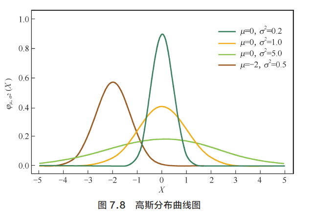 图7.8 是高斯分布曲线图。由图可见,高斯分布在极值点(0 点)处是平滑的,也就是高斯先验分布认为w 在极值点附近取不同值的可能性是接近的。这就是L2 正则化只会让w 更接0点,但不会等于0 的原因。
