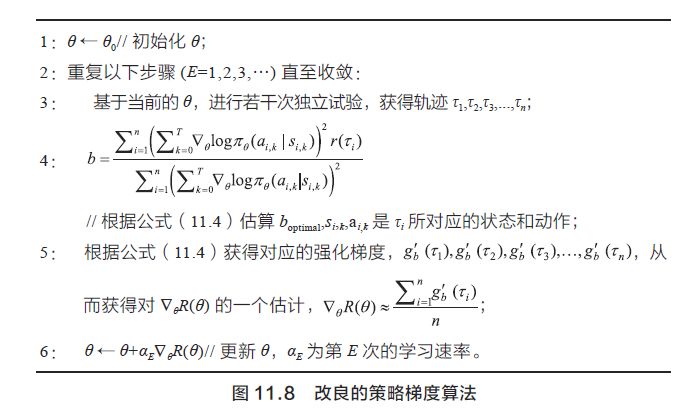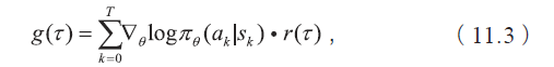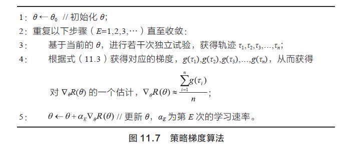 其中sk,ak 为轨迹τ 上每一步的状态和动作。这样,给定一个策略πθ,我们可以通过模拟获得一些轨迹,对于每条轨迹,可以获得其收益r(τ) 以及每一步的<状态、行动>对,从而可以通过式(11.2)和式(11.3) 获得当前参数下对梯度的估计。一个简单的算法描述如图11.7 所示。