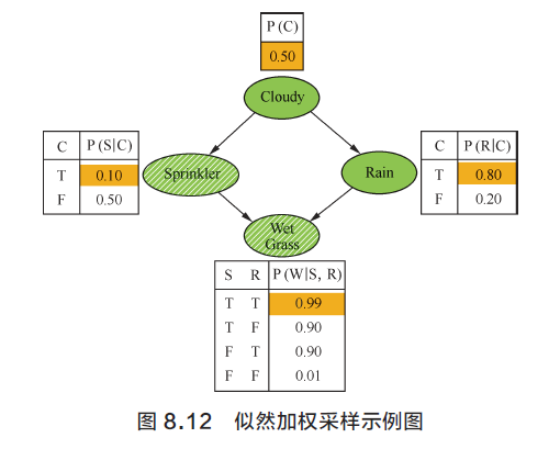 其中E 是观测变量集合。这种采样方法称作似然加权采样(Likelihood Weighted Sampling),产生的样本权值可以用于后续的积分操作。在有观测变量(Sprikler=T,WetGrass=T)时,可以先对Cloudy 进行采样,然后对Rain 进行采样,不再对Sprinkler 和WetGrass 采样(直接赋观测值),如图8.12 所示。这样得到的样本的重要性权值为