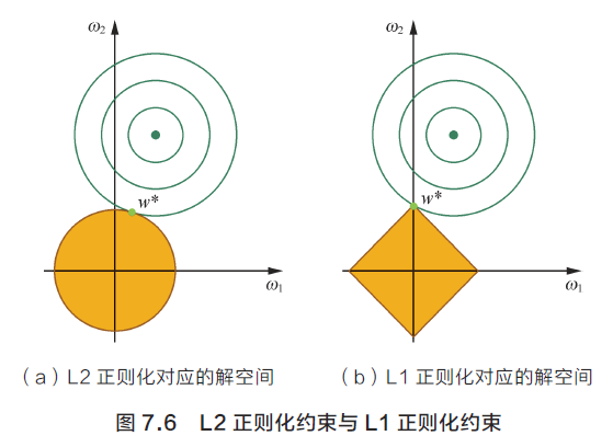 机器学习的经典之作给出的解释无疑是权威且直观的,面试者给出的答案多数也是从这个角度出发的。在二维的情况下,黄色的部分是L2 和L1 正则项约束后的解空间,绿色的等高线是凸优化问题中目标函数的等高线,如图7.6 所示。由图可知,L2 正则项约束后的解空间是圆形,而L1 正则项约束的解空间是多边形。显然,多边形的解空间更容易在尖角处与等高线碰撞出稀疏解。