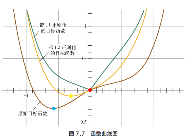 第二个角度试图用更直观的图示来解释L1 产生稀疏性这一现象。仅考虑一维的情况,多维情况是类似的,如图7.7 所示。假设棕线是原始目标函数L(w) 的曲线图,显然最小值点在蓝点处,且对应的w* 值非0。