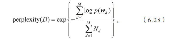 为了衡量LDA 模型在验证集和测试集上的效果,需要寻找一个合适的评估指标。一个常用的评估指标是困惑度(perplexity)。在文档集合D 上,模型的困惑度被定义为