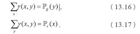 可以看到,当沙子分布和坑分布给定时,我们只关心搬运沙子的整体损耗,而不关心每粒沙子的具体摆放,在损耗不变的情况下,沙子摆放可能有很多选择。对应式(13.16),当你选择一对(x,y) 时,表示把x 处的一些沙子搬到y 处的坑,可能搬部分沙子,也可能搬全部沙子,可能只把坑填一部分,也可能都填满了。x 处沙子总量为,y 处坑的大小为
