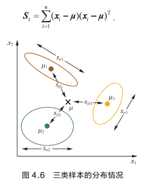 分别表示棕绿黄三类样本的中心,μ 表示这三个中心的均值(也即全部样本的中心),Swi表示第i 类的类内散度。我们可以定义一个新的矩阵St,来表示全局整体的散度,称为全局散度矩阵
