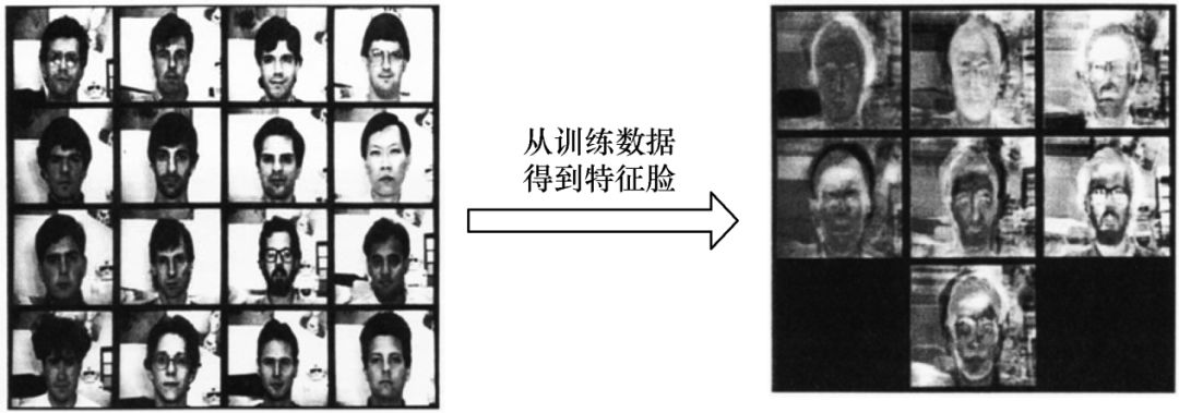 另外,在人脸识别领域中,PCA 和LDA 都会被频繁使用。基于PCA 的人脸识别方法也称为特征脸(Eigenface)方法,该方法将人脸图像按行展开形成一个高维向量,对多个人脸特征的协方差矩阵做特征值分解,其中较大特征值对应的特征向量具有与人脸相似的形状,故称为特征脸。Eigenface forRecognition 一文中将人脸用7 个特征脸表示(见图4.7),于是可以把原始65536 维的图像特征瞬间降到7 维, 人脸识别在降维后的空间上进行。然而由于其利用PCA 进行降维,一般情况下保留的是最佳描述特征(主成分),而非分类特征。如果我们想要达到更好的人脸识别效果,应该用LDA 方法对数据集进行降维, 使得不同人脸在投影后的特征具有一定区分性。