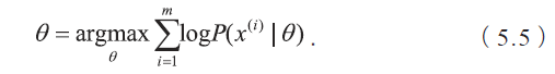图5.5 是一个θ 为一维的例子,其中棕色的曲线代表我们待优化的函数,记为f(θ),优化过程即为找到使得f(θ) 取值最大的θ。在当前θ 的取值下(即图中绿色的位置),可以计算,此时不等式右侧的函数(记为r(x|θ))给出了优化函数的一个下界,如图中蓝色曲线所示,其中在θ 处两条曲线的取值时相等的。接下来找到使得r(x|θ) 最大化的参数θ′,即图中红色的位置,此时f(θ′) 的取值比f(θ)(绿色的位置处)有所提升。可以证明,f(θ′) ≥ r(x|θ)=f(θ),因此函数是单调的,而且