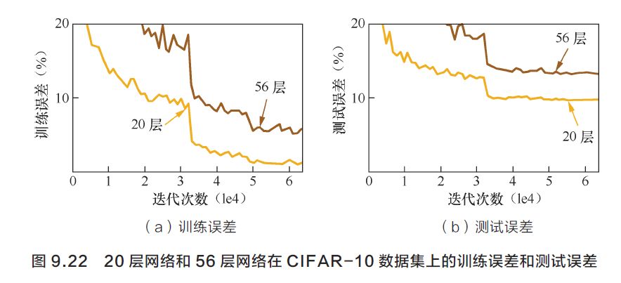ResNet的提出背景是解决或缓解深层的神经网络训练中的梯度消失问题。假设有一个L 层的深度神经网络,如果我们在上面加入一层, 直观来讲得到的L+1 层深度神经网络的效果应该至少不会比L 层的差。因为我们简单地设最后一层为前一层的拷贝(用一个恒等映射即可实现),并且其他层维持原来的参数即可。然而在进行反向传播时,我们很难找到这种形式的解。实际上,通过实验发现,层数更深的神经网络反而会具有更大的训练误差。在CIFAR-10 数据集上的一个结果如图9.22 所示,56 层的网络反而比20 层的网络训练误差更大,这很大程度上归结于深度神经网络的梯度消失问题。