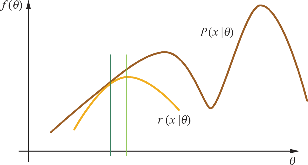 不等式右侧函数记为r(x|θ)。当等式成立时,我们相当于为待优化的函数找到了一个逼近的下界,然后通过最大化这个下界可以使得待优化函数向更好的方向改进。