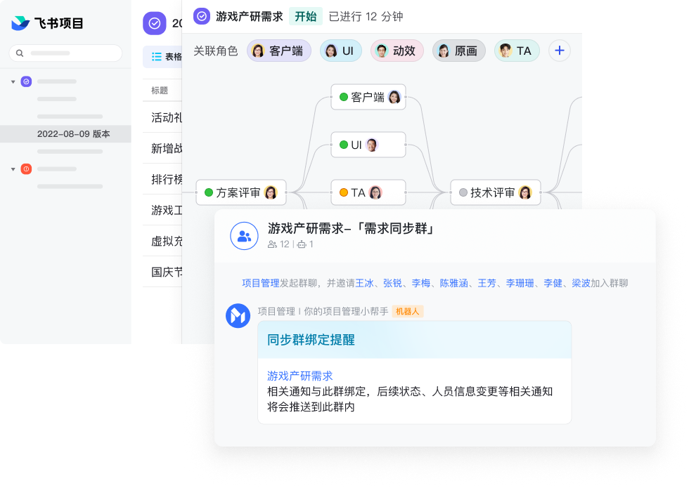 于细微之处彰显飞书项目的魅力。飞书项目的“需求关联群”功能可以消除信息不对等带来的流程损耗;“自动拉群”让相关角色一键入群,针对需求进行深度沟通。后期新加入的成员随着新增关联角色,就可以自动入群,阅读群内的永不删除的消息记录,了解过往背景、历史决策和最新进展等信息。
