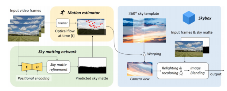 天空遮罩框架(Sky Matting Network):用于检测视频帧中天空区域的视频框架。该框架是采用了基于深度学习的预测管道,能够产生更精确的检测结果和更具视觉效果的天空蒙版。