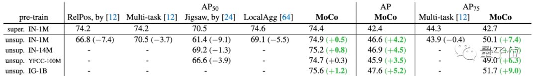 在ImageNet、CoCo等数据集上,MoCo甚至在某些情况下大大超越了监督预训练模型。