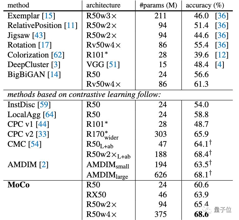 当K较小时,端到端方法的表现与MoCo差不多,但其批处理大小受限,在8个32GB的V100上,最大的mini-batch仅为1024。并且,即使存储空间足够大,由于端到端方法必须满足线性学习率缩放规则,否则精度会下降,其增长趋势能否推及到更大规模是存疑的。