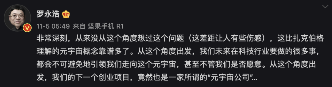 「交个朋友」的罗永浩也发博透露自己下一个创业方向,「竟然」也是元宇宙。