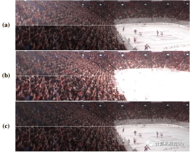 3、曝光校正。为了能够得到较大的曝光范围,该阵列全景相机都设置为自动曝光模式。但这会带来一个严重的后果,就是相邻的相机因为朝向不同,曝光量可能会差距特别大(能够达到3倍)。这不仅会造成拼接困难,还会因为左右眼曝光差异过大给3D效果带来极大的不适感。如下图所示,(a)、(b)、(c)中上半部分表示立体全景图中的左视图,下半部分表示右视图。(a)是未进行曝光校正的结果,左右图曝光差别较大(b)是HDR校正结果,可以看到校正后出现了过曝,(c)是本算法校正后的结果。