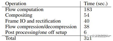 虽然两张图光流计算只需5s,但是一次同时输入16张图,前后向光流需要各算一次,所以主要的时间耗费在光流的计算上了。每张立体全景图平均处理时间分布如下图所示: