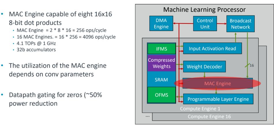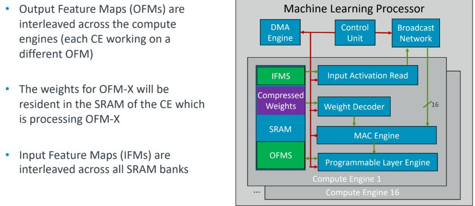 搭建架构的模块是计算引擎,每块为64 KB的SRAM片,共16块。 MAC引擎(与英伟达的TensorCore不同)是执行卷积化的地方,可编程层引擎负责处理网络各层之间的大部分必要的shuffling。该架构具有DMA引擎,用于与外部存储器接口进行通信。 ARM自己的Cortex技术负责的引擎控制。