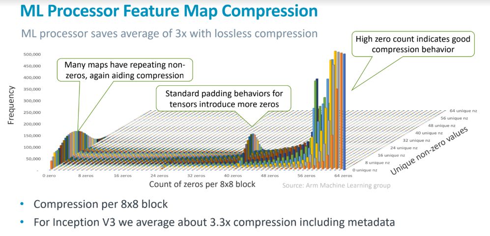 使用机器学习处理器特征映射压缩技术可以获得更高的效率,这些技术听起来和DeePhi在CNN压缩上的作用类似。
