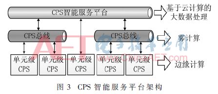由多个单元级CPS组成的复杂CPS是目前工业应用中最常见的模式,其中不同基本单元级CPS之间的协同计算和操作是确保整个CPS系统性能的关键。如图3所示[3],通过雾计算技术的应用,将数据的处理、数据存储和应用程序集中在靠近网络边缘的设备中,一方面使中心服务器的计算任务下移,减轻了中心服务器的负载以及远程数据传输中对网络带宽的占用;另一方面,将边缘智能感知设备的深度数据处理操作上移到雾计算处,降低了对边缘设备在计算能力上的压力。雾计算更能够发挥CPS中各组成单元的计算资源优势,让数据的存储和处理相对分散,让有价值数据的流动更加高效、实时,使整个CPS中资源的配置更加优化。