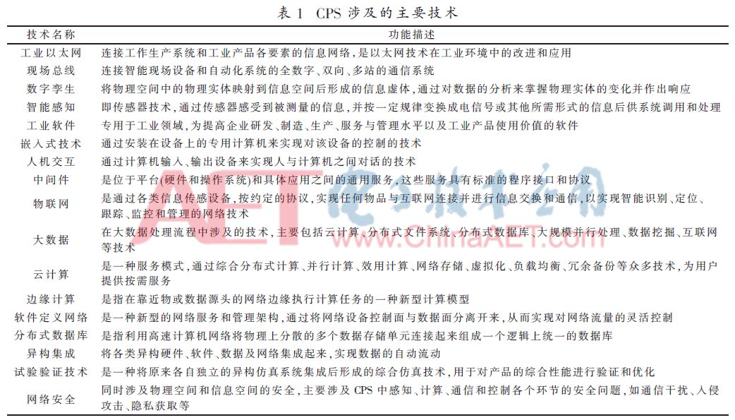 CPS的复杂性和多学科交叉性体现在其技术的广泛性和实现方式的综合性。通过对CPS组成结构和主要功能的分析,在表1中列出了CPS中涉及的一些主要技术[3]。